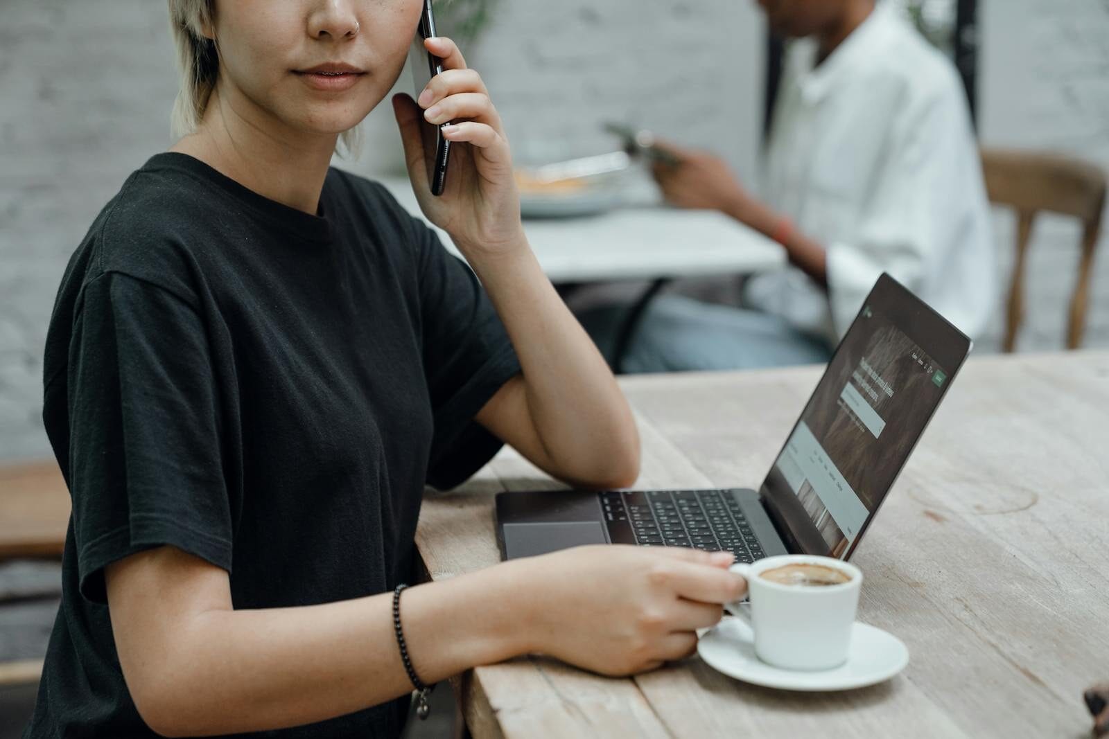 Crop Asian lady in black tee making phone call while sitting at table with coffee and laptop in cafe